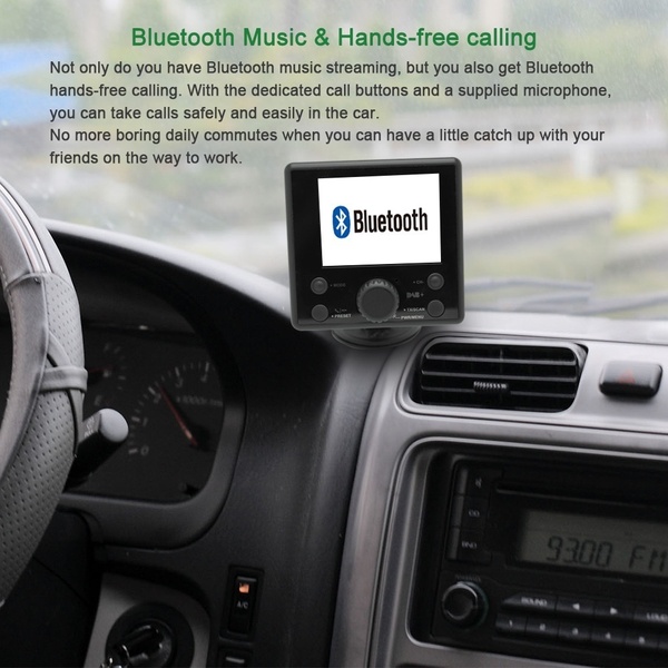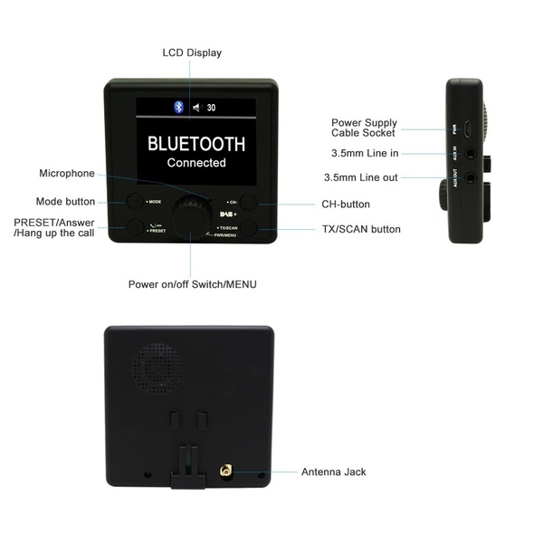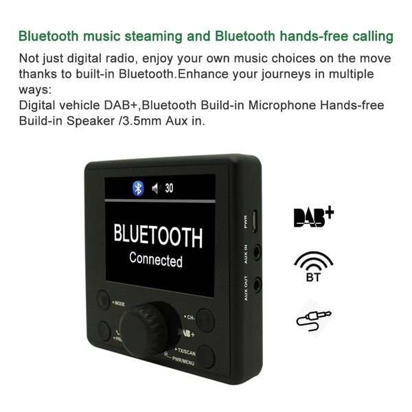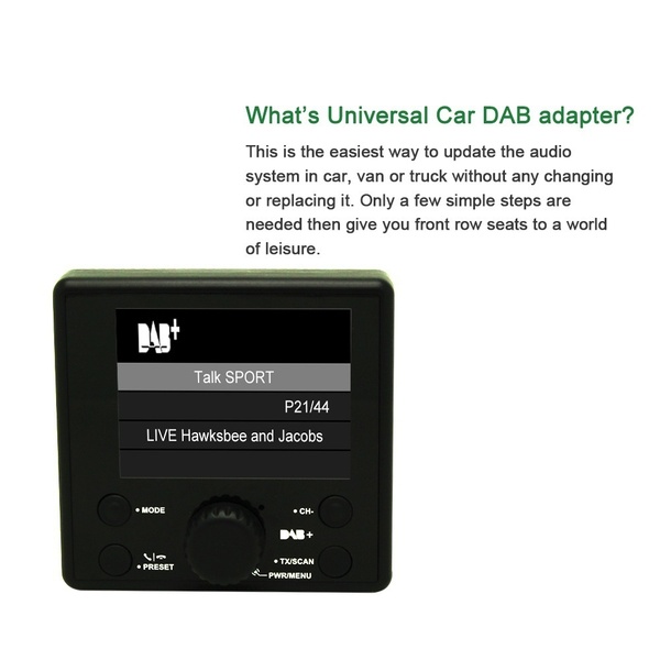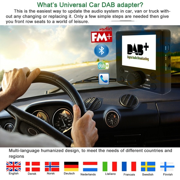 Product Specifications: Radio DAB/DAB+ Frequency Ranges: DAB Band III 174-240MHZ FM Transmitter 87.5-108MHZ Power Supply: Micro USB 5V Antenna Power supply: 5V , 1.5A Bluetooth version: 2.1 Built-in Speaker : 1.0W 8ohm Output connectors: 3.5MM Stereo Jack for audio Dimensions: 80X 80X16MM Net Weight:285g Enjoy the Digital radio world Whether you’re new to digital radio or already enjoy the great choice and quality of digital radio at home you’ll love listening in your car with our Dab adapter . Designed as an easy-fit solution for the millions of vehicles on the road worldwide without digital radio, just a few simple installation steps and you’ll be up and running. Bluetooth Audio Streaming, Bluetooth Hands-free Calling Pair your phone or tablet with the dab adapter over Bluetooth and listen wirelessly to your own music, or to your favourite music streaming service. Not only do you have Bluetooth music streaming, but you also get Bluetooth hands-free calling. With the dedicated call buttons and Built-in microphone, you can take calls safely and easily in the car. No more boring daily commutes when you can have a little catch up with your friends on the way to work. Multiple Languages: To meet the needs of users from different countries and regions, The device have languages options:English, Dansk, Norsk, Deutsch, Nederlands, Ltalian, Francais, Swedish, Finnish.