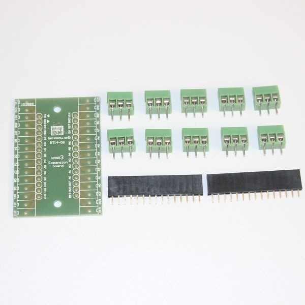 This is a terminal adapter for the Arduino Nano. It lables for Arduino Nano version 3.0, however you can still use this adapter for the older version (just have to remember that A0-A7 are in the reverse order). You can use this adapter to easily hook up Nano to an outside world via hook up wires.