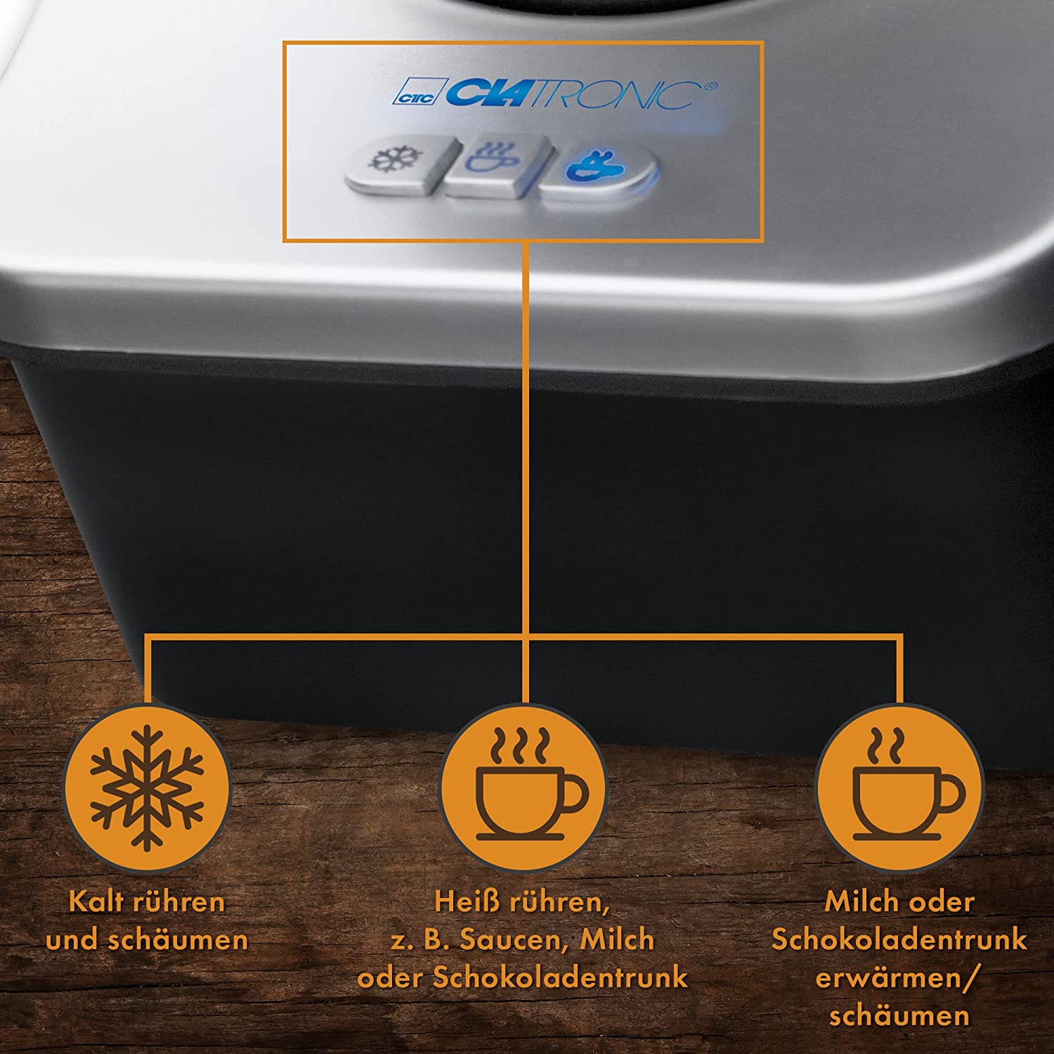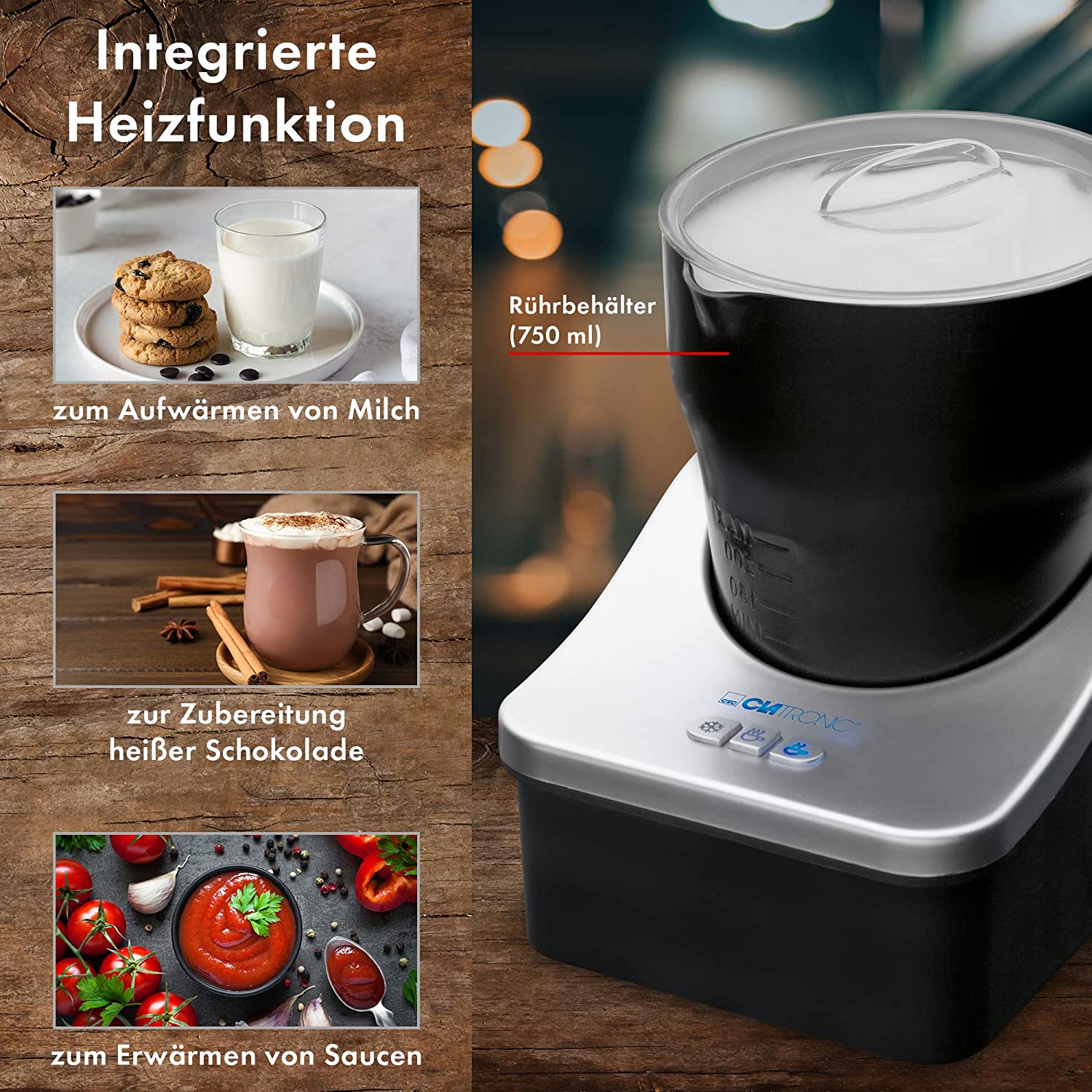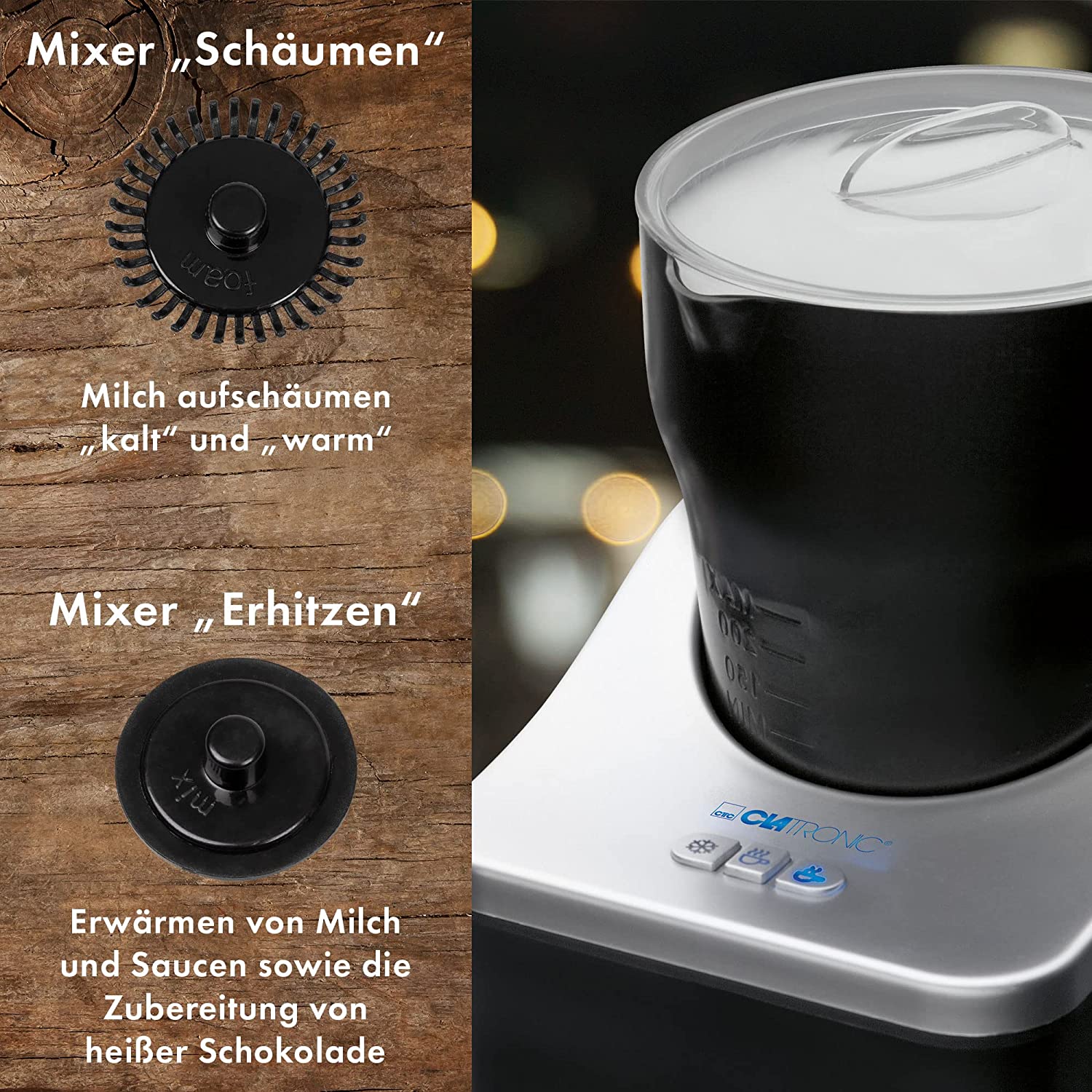 Clatronic Milchaufschäumer, Milchaufschäumer elektrisch für heiße und kalte Milch, Milchschäumer mit 3 Funktionsschaltern, innen u. außen antihaftbeschichtet, Milchschaummenge ca. 500ml, MS 3326