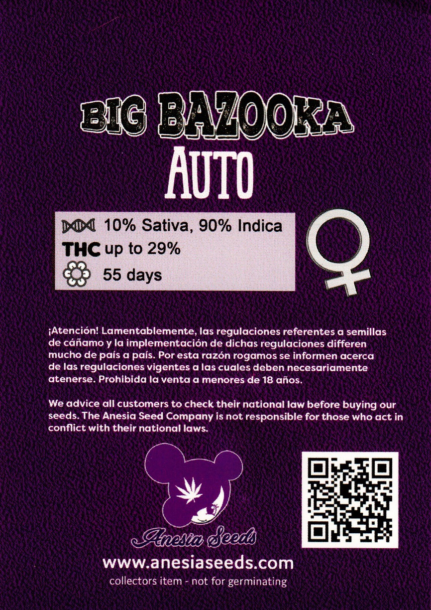 She’s a monster in fact: Buds with countless and endless resin crystals, a extremely strong High and surprisingly big and heavy yields. Big Bazooka is a pure Indica exciting even the most experienced smokers with a powerfull high. Big Bazooka is the intersection of a Big Bud selection with a selected Jack Herer. The strain was created for ist potency and an extreme high THC-level.
