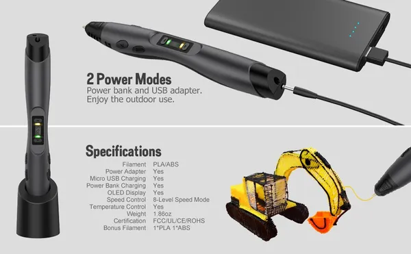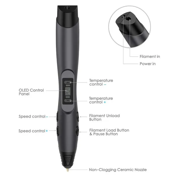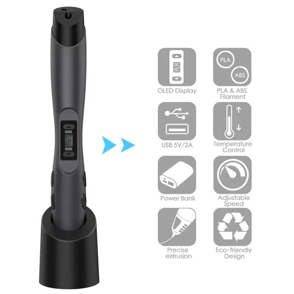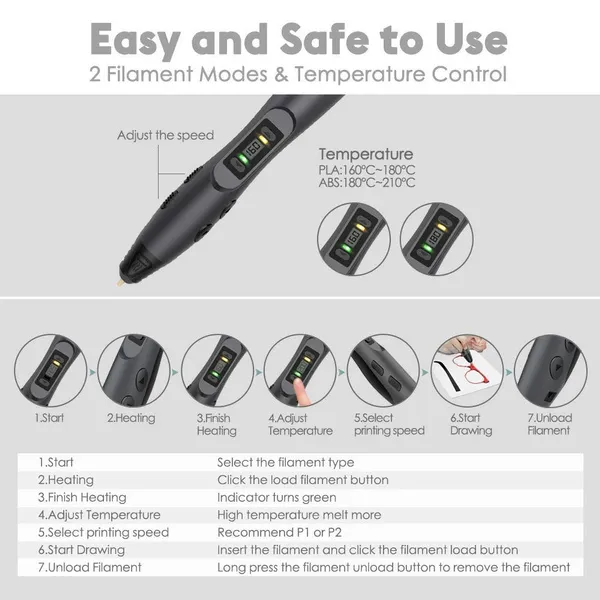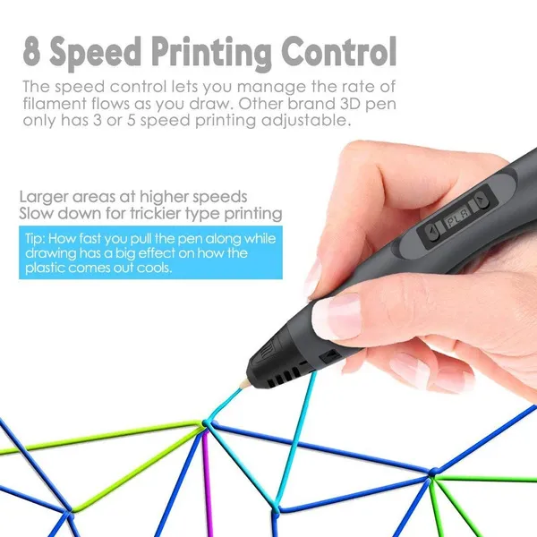 √ 2 FILAMENTE UNTERSTÜTZT - Kann PLA (160-180 ℃) und ABS (180-210 ℃) Filamente nachfüllen und Filamente mit einem Durchmesser von 1,75 ± 0,02 mm verwenden. So können Sie Ihr bevorzugtes Material frei wählen. √ 8-STUFEN-GESCHWINDIGKEITSREGELUNG - Mit dieser 8-Stufen-Geschwindigkeitsregelung bietet dieser 3D-Stift ultimative und grenzenlose Kreativität. Es ist nicht nur für Kinder ab 5 Jahren geeignet, sondern auch ein tolles interessantes Werkzeug und Geschenk für Erwachsene. Verwenden Sie es, um erstaunliche dreidimensionale Meisterwerke zu skizzieren, zu drucken oder zu kritzeln. √ EINSTELLBARES TEMPERATURDESIGN - Mit patentierter Keramikdüse und einstellbarem Temperaturdesign ist dieser 3D-Stift beim Zeichnen außerordentlich freundlich und sicher. Außerdem bietet es ein genaues und stabiles Extrudieren. √ OLED-DISPLAY - Das OLED-Display zeigt nicht nur die Art des verwendeten Materials (ABS oder PLA), sondern auch die Temperatur an. So wird es für Sie einfach und bequem, die Kontrolle über diesen 3D-Stift zu erlangen. √ VIEL SICHERER - Es wird mit 2 Fingerschützern geliefert, um Ihren Daumen und Zeigefinger abzudecken, um Verletzungen während des Gebrauchs zu vermeiden. Da die Spitze des Stifts heiß wird, während der Stift arbeitet, ist es erforderlich, dass Kinder diesen Stift unter Aufsicht von Erwachsenen verwenden. Der SL-300 ist der professionelle 3D-Druckstift. Es unterstützt zwei Filamente und Sie können die Ziehgeschwindigkeit und -temperatur anpassen. Das perfekte Geschenk für Sie selbst, Ihre Freunde oder Familie! Spezifikation: Leistungsaufnahme: 100-240 V 2 A Ausgangsleistung: DC 5V/2A 10W Kompatible Filamente: 1,75 mm PLA/ABS Empfohlene Hitze für Filamente: ABS: 180-210 ℃ PLA: 160-180 ℃ Paket beinhaltet: 1 * 3D-Stift 1 * AC/DC-Adapter 1 * hübscher Halter 1 * Benutzerhandbuch 2 * 1,75 mm Filament (zufällige Farben) Sicherheits- und Warnhinweise: 1. Kinder sollten es unter Aufsicht von Erwachsenen verwenden. 2. Die 3D-Stiftdüse ist während der Arbeit heiß. KEINE BERÜHRUNG, UM EIN BRENNEN ZU VERMEIDEN