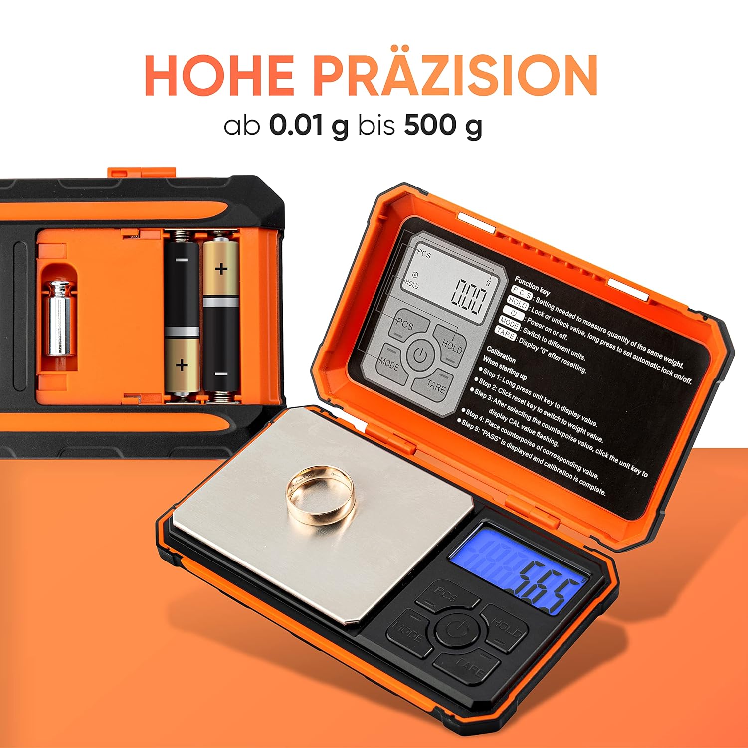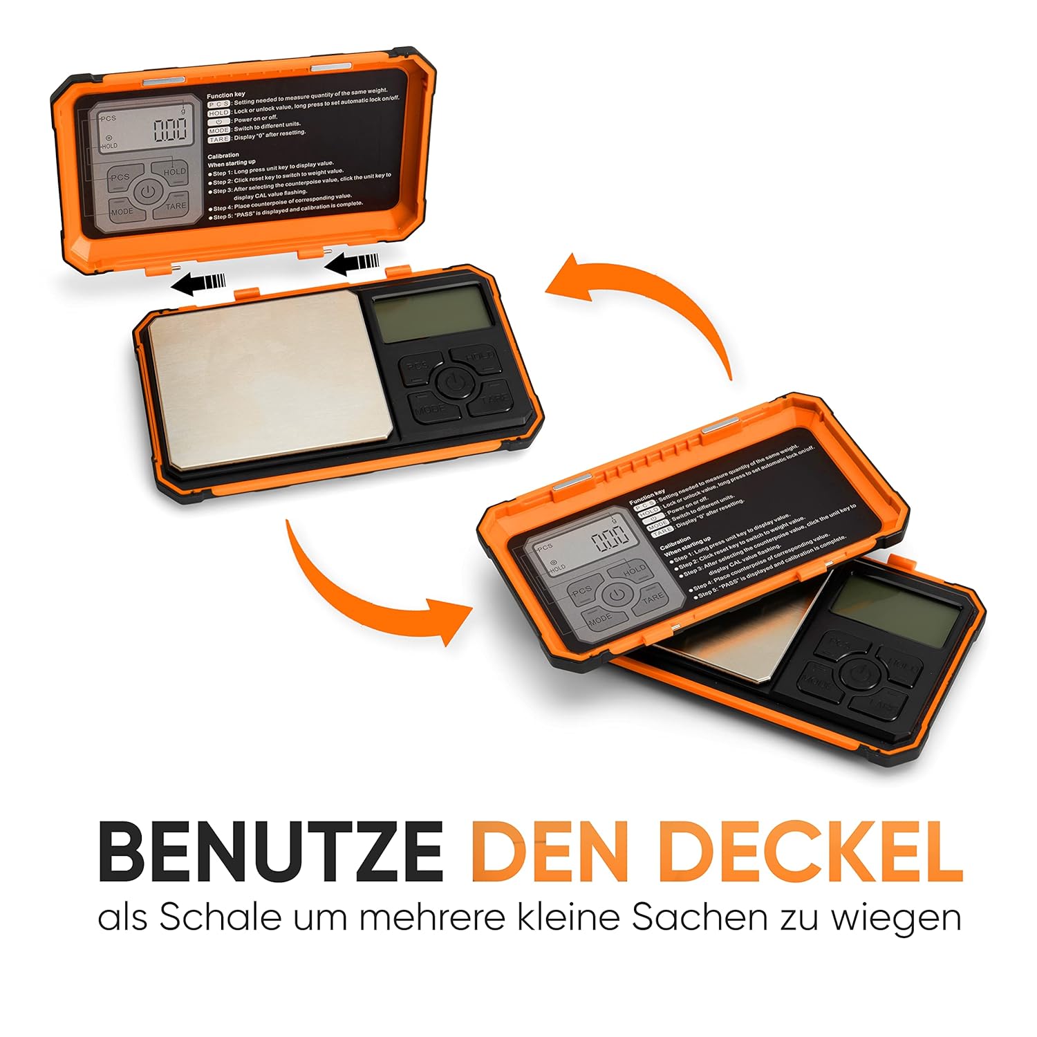 Die Grammwaage ist nicht nur präzise und genau, sondern auch noch extrem robust dank dem speziellen Gehäuse. Der Deckel der Hülle kann zusätzlich noch als Schale verwendet werden, damit du auf jeden Fall nichts verlierst.