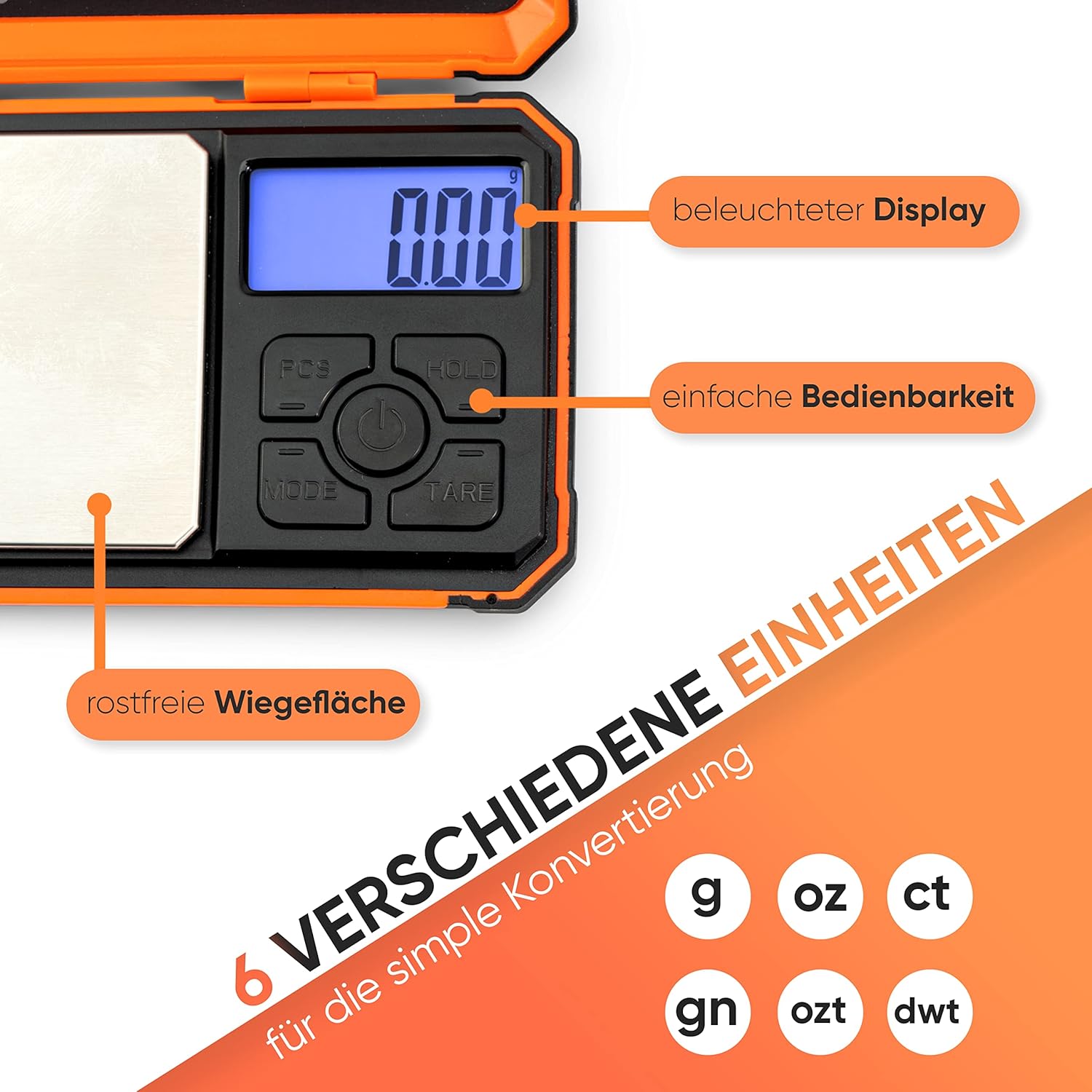 Gemessen werden kann in g, oz, ozt, ct und gn bis zu einem Gewicht von 500g in 0.01g Schritten. Das Ergebnis wird dir bequem im Digitaldisplay angezeigt.